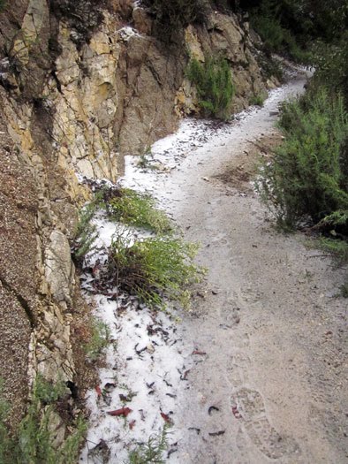 The trail moves on high above the canyon with great views. You descend slightly for a few minutes as the trail rounds around several ravines through some dense forest. You’ll pass a three-mile marker (green wooden stake on your left). You’ll hear and see the creek far below. After you head down a ways you will arrive at Decker Springs. Past the springs, follow the switchbacks on… there are lots of down oaks and you have to crawl under several before you round around to reach the shady site of Orchard Camp. Here is a wonderful area to enjoy the beauty and have some lunch unless of coarse it is pouring rain, hail or snowing and super cold. Then as we did, stay briefly, and head back down the same trail. Total 7 miles roundtrip.