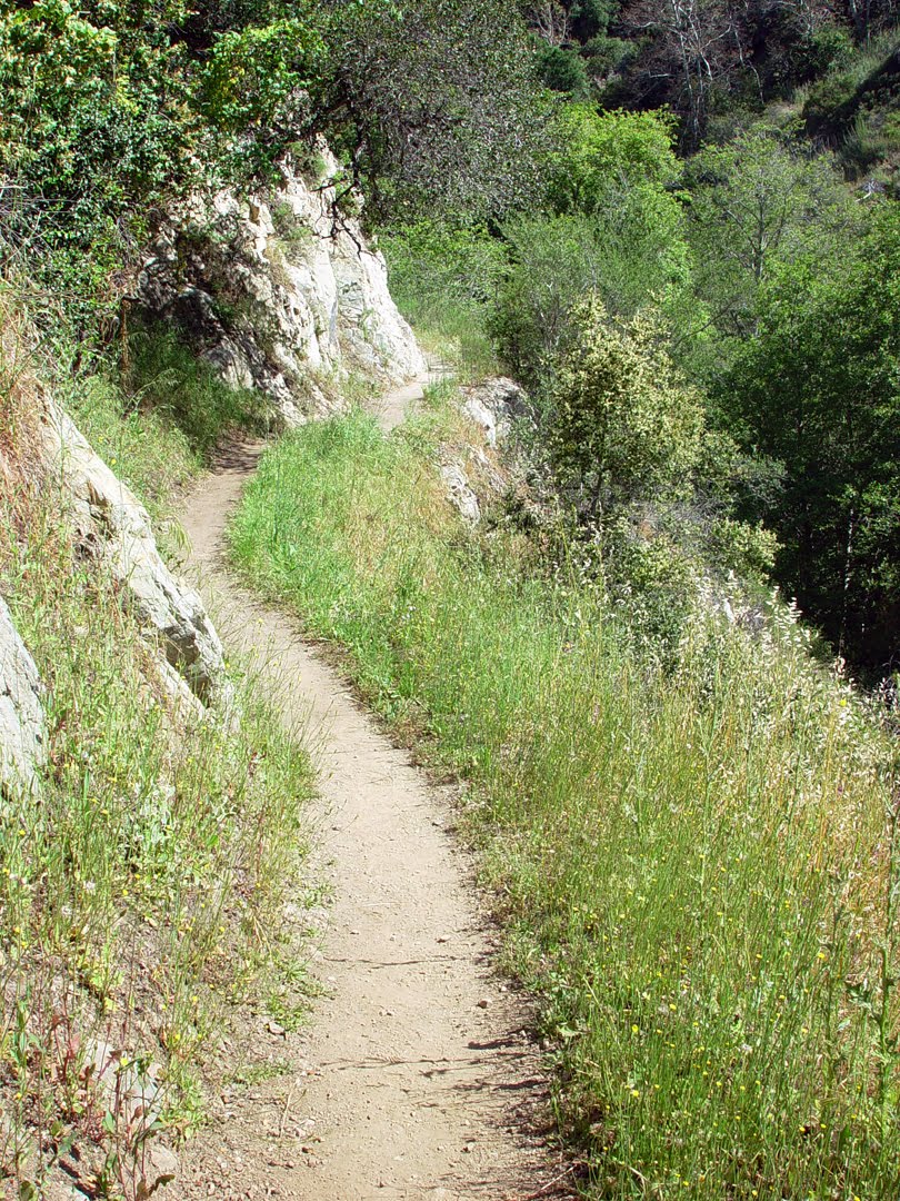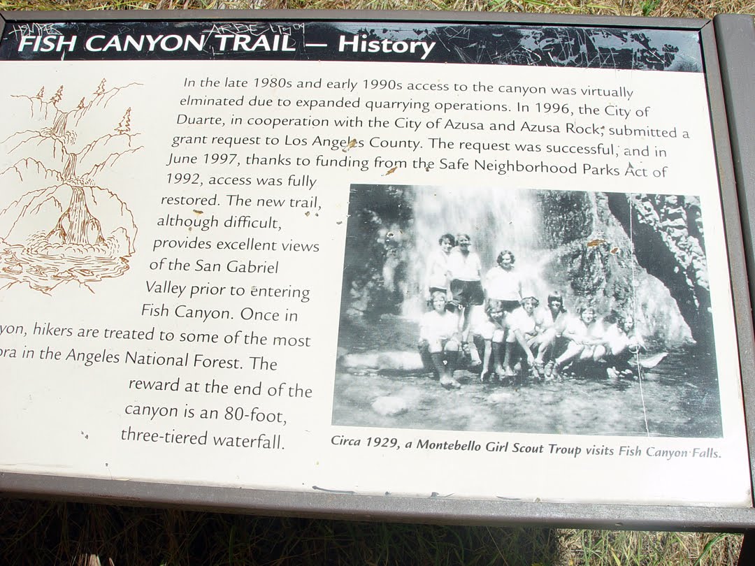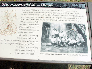 Along the 4-mile hike you will find impressive greenery. The canyon is full of Big-leaf maples, California bays, alders and live oaks. In springtime you will see an assortment of wildflowers including the California poppy, lupine, campanula, larkspur and brodiaea line the walls of this enchanted forest. Stone foundations, walkways, and walls of old cabin sites from the early 1900s can be seen. The cabins were destroyed in a fire and flood in the late 1950s. The culmination of the hike is the breath-taking Fish Canyon Falls. This waterfall drops 90 feet in three stair-stepped tiers, finally sliding its way into a large and clear pool.
