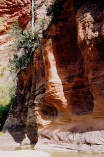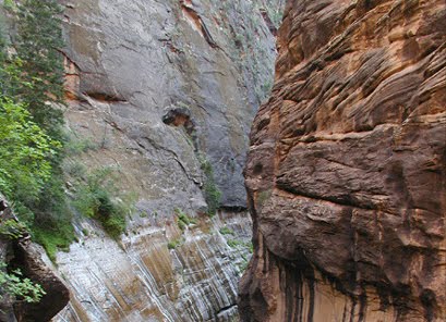 Pine Creek Slot CanyonPine Creek has dug a challenging slot canyon into the stone below the Mount Carmel Tunnel, ending at the east entrance to the tunnel. This is a technical slot with a lot of rappelling required in order to descend from the Canyon Overlook parking lot to the Pine Creek Waterfall. Depending on the season and the amount of rainfall, there are often large pools within this part of the canyon that need to be waded between rappels.