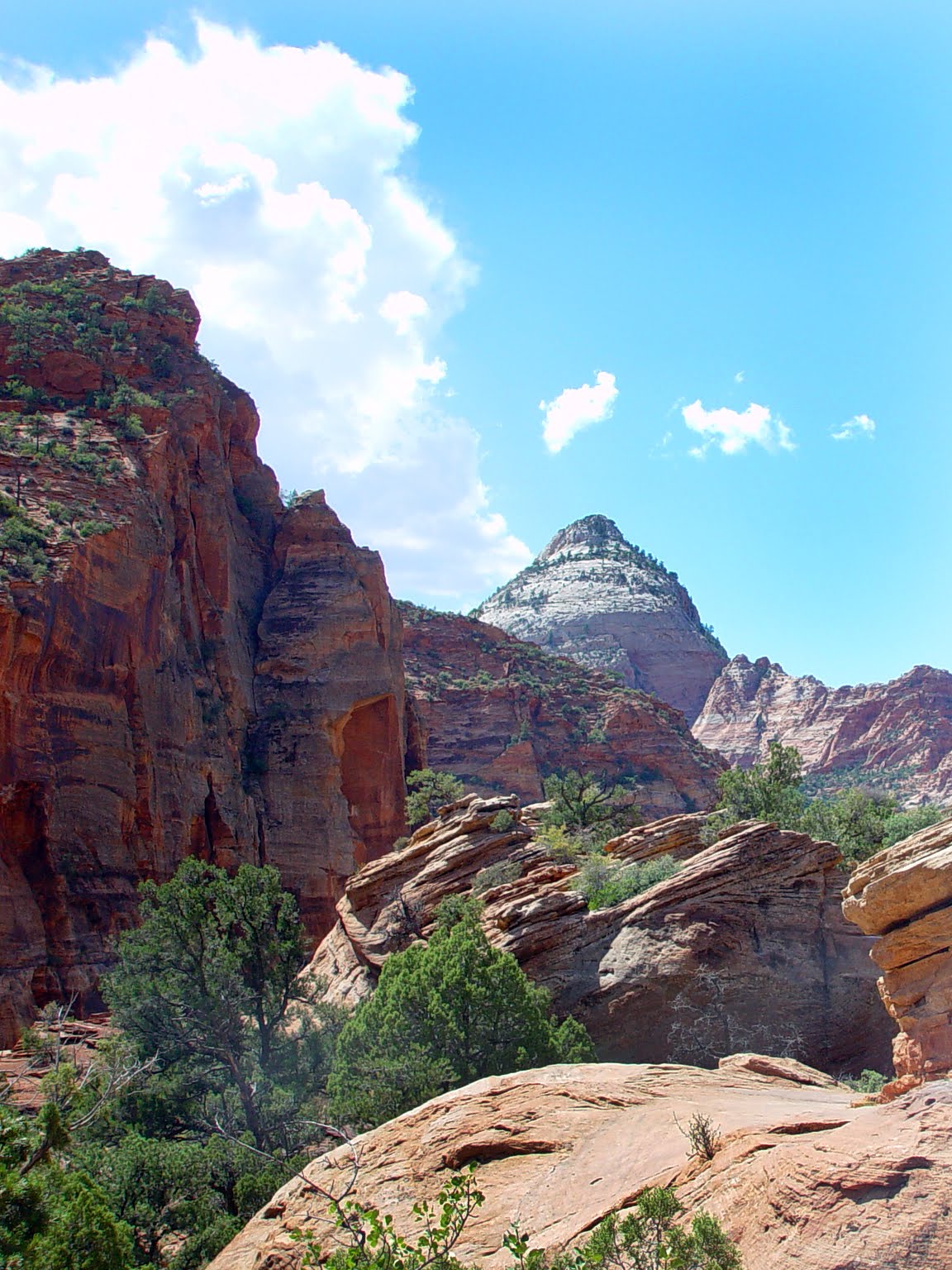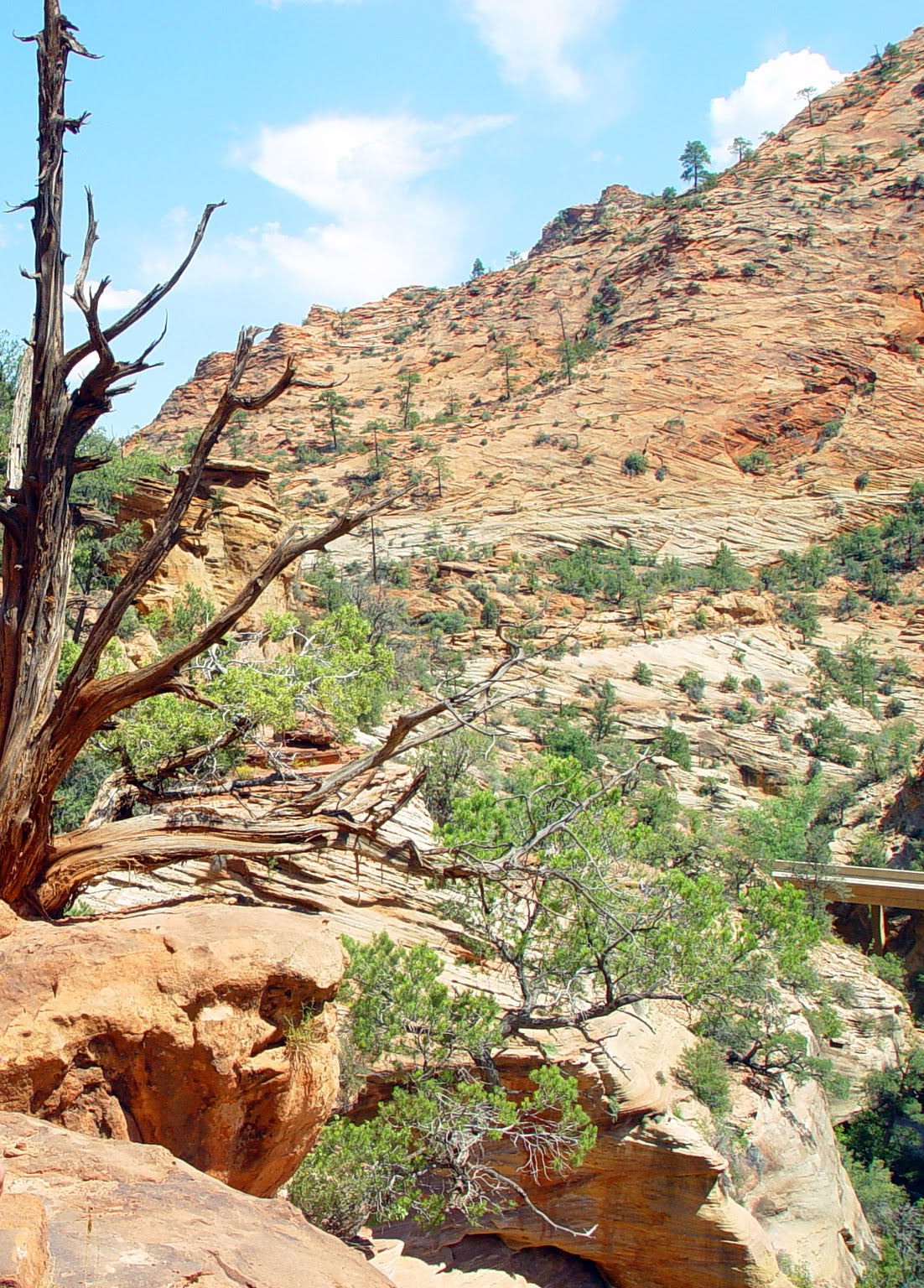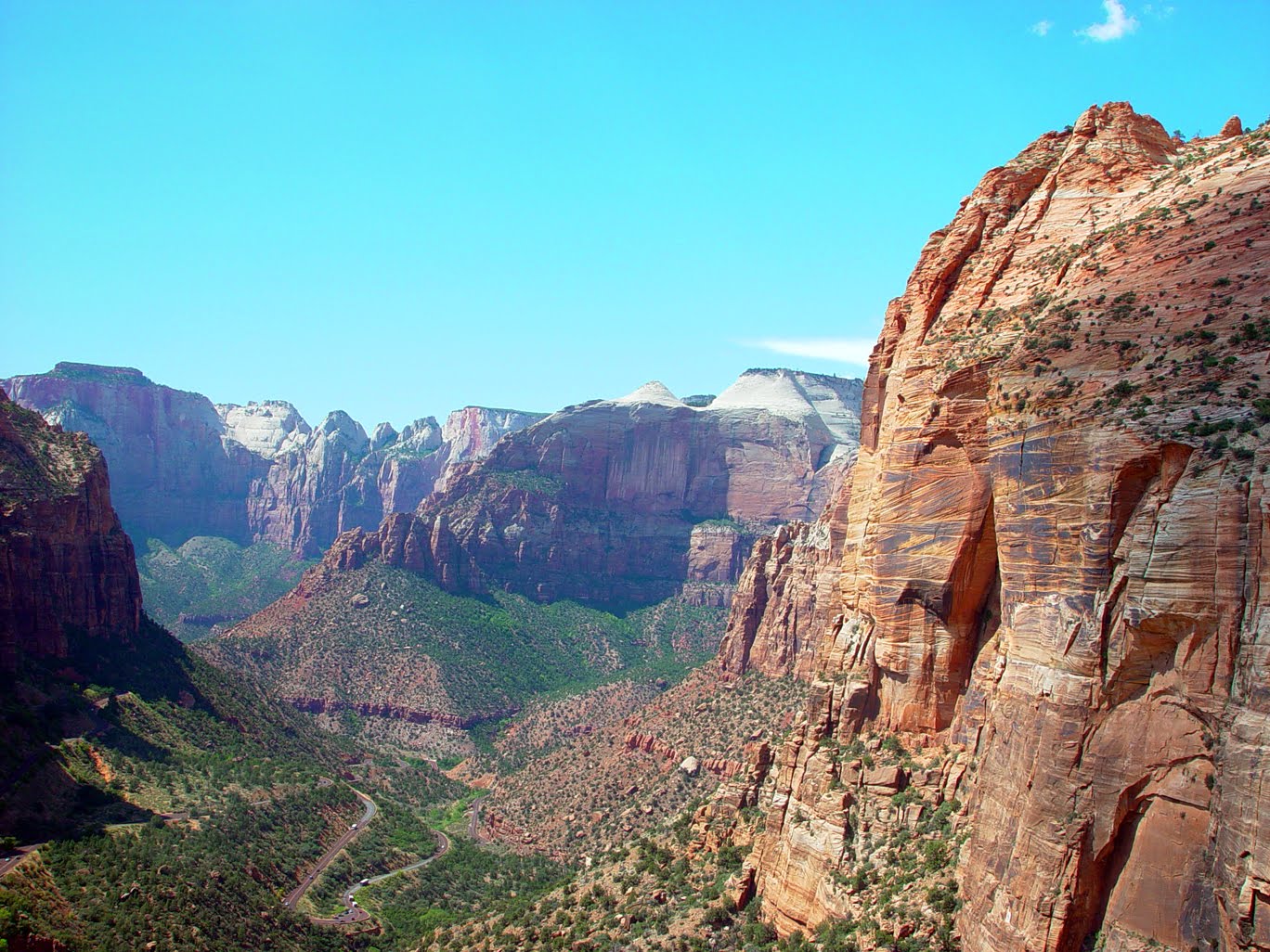 Canyon OverlookThe overlook is fairly easy to get to, and even most kids will find the trek more exciting than strenuous. From the Overlook itself, along with the awesome view into the lower end of Zion Canyon, visitors can ascend the East Temple Saddle, and then explore the upper end of Pine Creek.