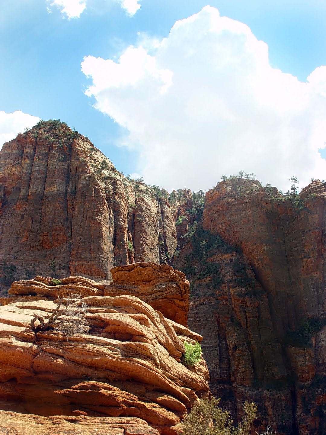 Grotto TrailLength: .6 miles one wayDifficulty: EasyDescription: The Grotto Trail is a short stretch that connects the Grotto picnic area to Zion Lodge. It is level (negligible elevation gain), short, and easy, but gives visitors a nice taste of the spectacular canyons. You can make this route a full loop by taking the Grotto Trail from the picnic area down to Zion Lodge, and from there crossing the river, exploring the Emerald Pools, and then following the kayenta Trail back to the Grotto picnic area. The trail ends at the Zion Lodge, which has a restaurant, some shops, and most importantly, water.