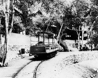 Shady trees and the stone and cement foundations are welcome signs that the top was achieved and it allows one to have a sigh of relief. Enjoy the fascinating mixture of raised levels and low levels where the buildings stood and try to see the hotel with its tourists from Los Angeles in their suits and derby hats enjoying themselves on the wide balcony of the hotel while overlooking the wilderness and city scenes below.