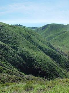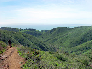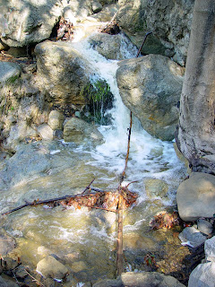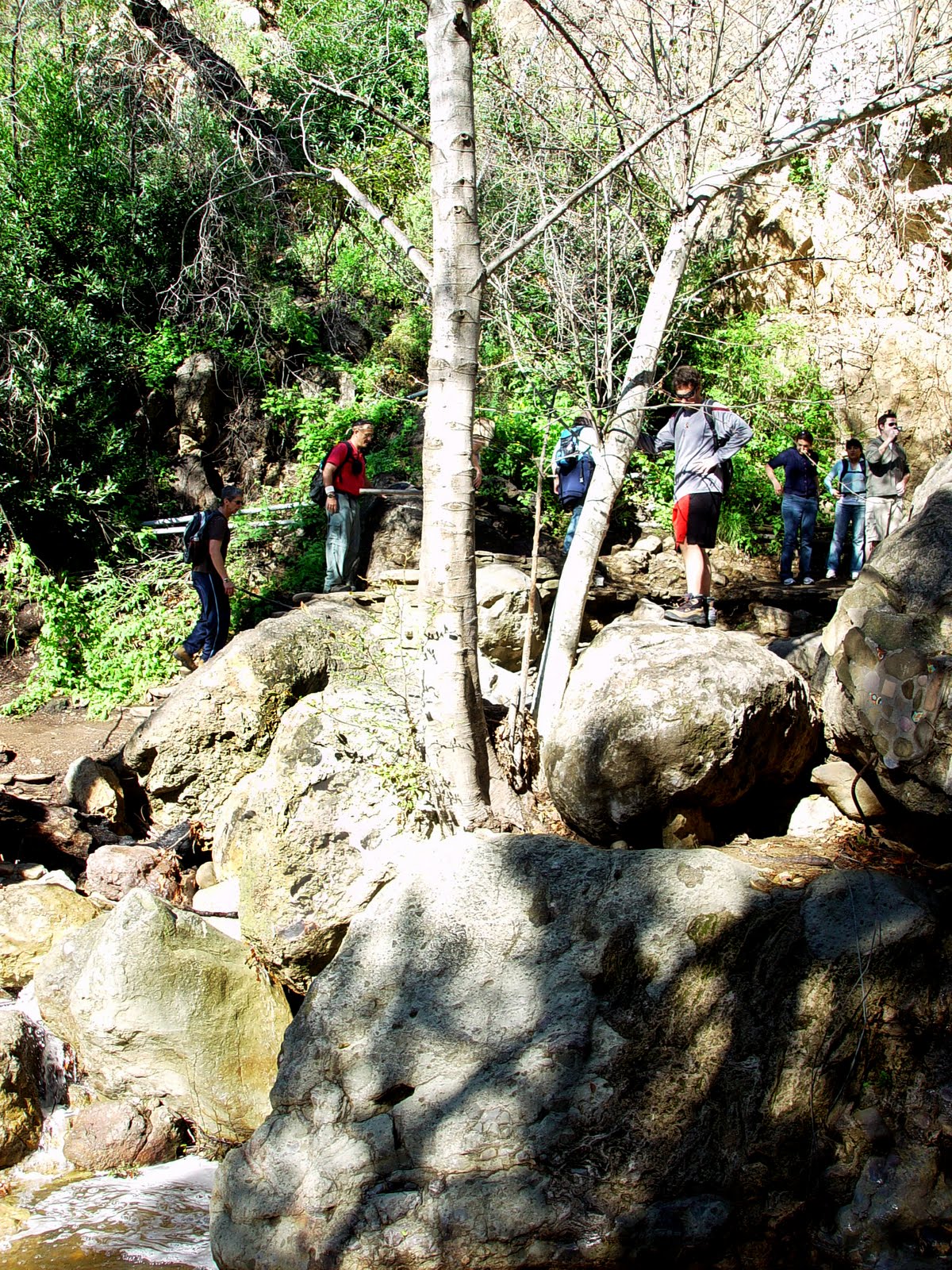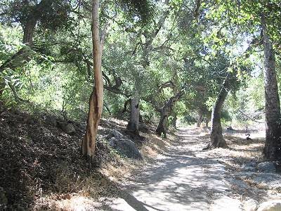 Summary: From the gate, follow the service road that runs along the right side of the creek. Bear right at the dirt road that takes you up to the 2 odd looking buildings that house the Santa Monica Mountains Conservancy. To the right of the second building, take the Rising Sun Trail. This trail heads up the ridge, with great views of the ocean, then drops down into the somewhat mysterious Tropical Terrace. This is actually the ruins of a home build in the 1960s, and burned in 1982. There are exotic plants, lovely pools, a 30 foot waterfall, and a hidden statue of the Virgin Mary just before you cross the creek heading into the ruins. This is really a fun place to explore!